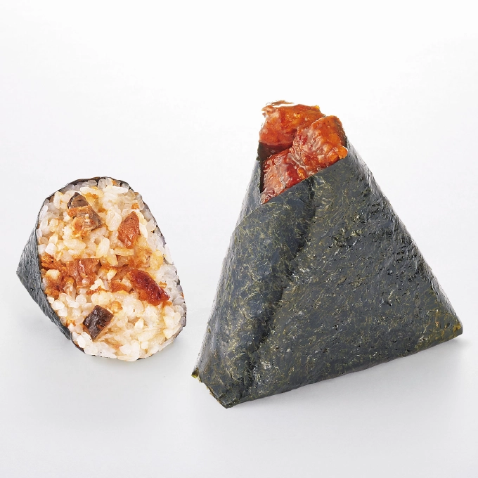 名古屋名物「ひつまぶし」のおむすび。三河一色産うなぎの混ぜご飯に蒲焼き2切をのせて。580 ~ 650円